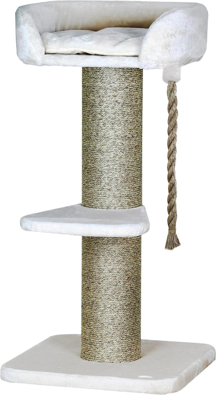 Kattklösbräda med plyschsovplats och lekrep. Detta klösträd och klätterträd erbjuder din katt en sovplats i mjuk plysch, perfekt för avkoppling, och ett lekrep för underhållning. Perfekt för att uppfylla din katts naturliga behov och ge en rolig upplevelse.